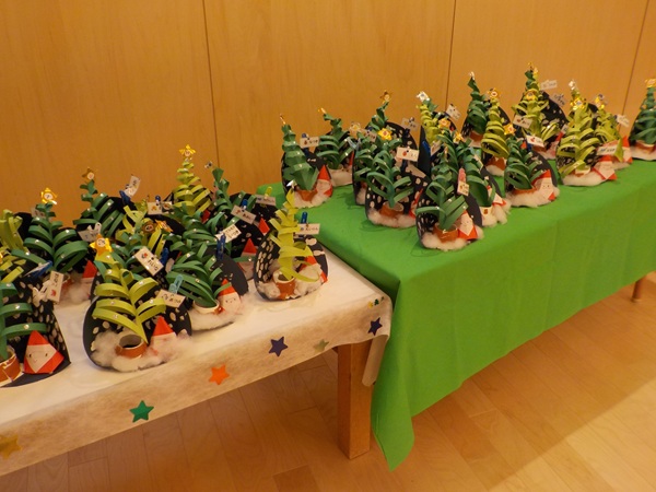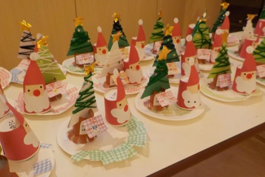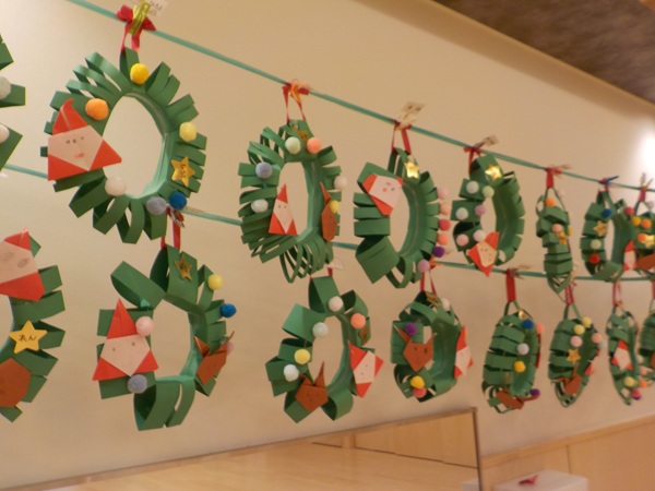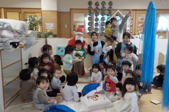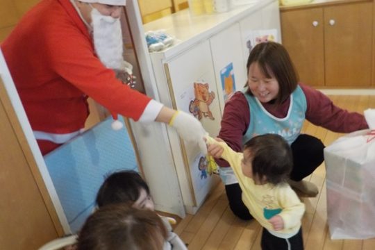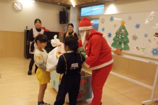 12月25日(木)クリスマスの日に、大川保育園にもサンタクロースが来てくれました。ひよこ組さんやりす組さんは見慣れない人に少し驚いていましたが、興味はあるようで遠くから見ている子もいました。クリスマス会では、クリスマスにちなんだクイズが出されて、答えるとツリーに飾り付けを付けられるという楽しい出し物が行われました。プレゼントは、クラスの代表の子がサンタさんからしっかり受け取っていましたよ。ホールには3,4,5才児のクリスマス制作が飾られてクリスマスムードを盛り上げてくれました。
