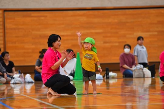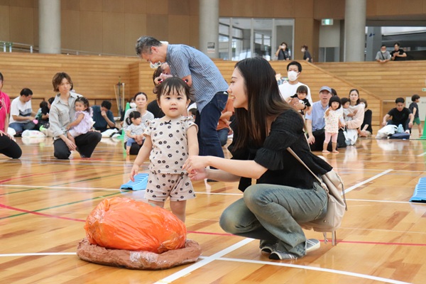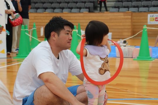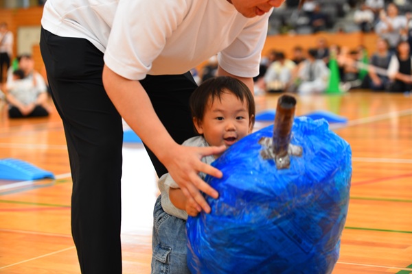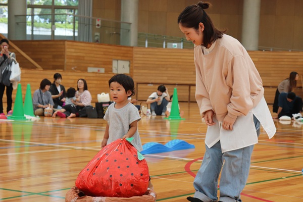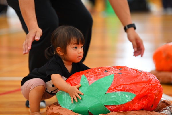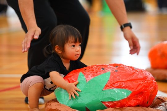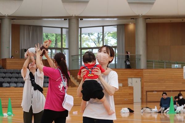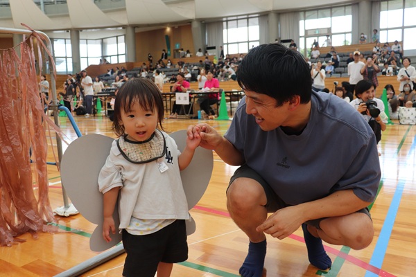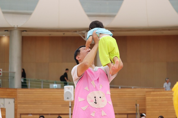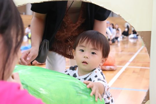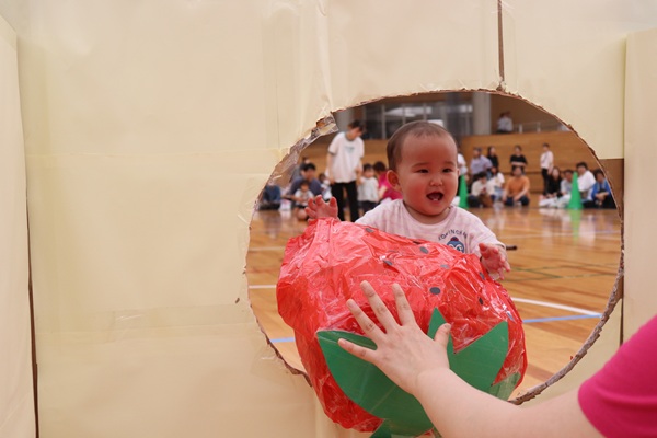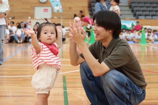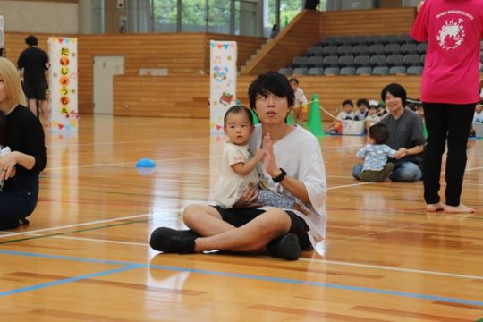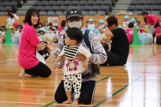 ひよこ組さんは、おうちの人とふれあい遊びを楽しみました。広い会場に少しびっくりしている様子もありましたが、ギューッとしてもらったり高い高いしてもらったりふれあい遊びをしている間はいつものニコニコ笑顔が見られました。