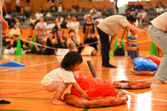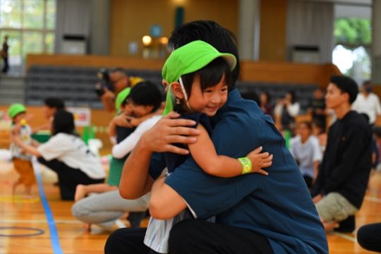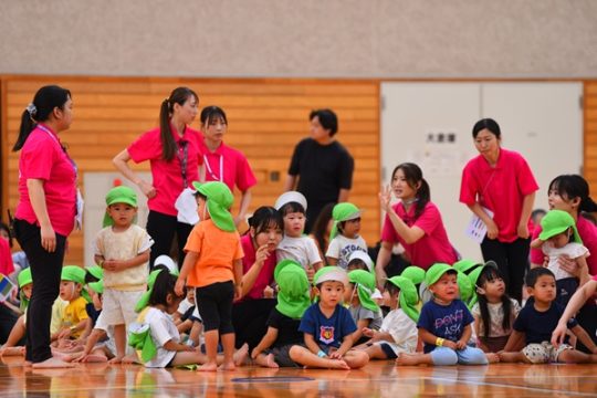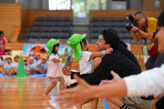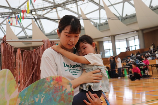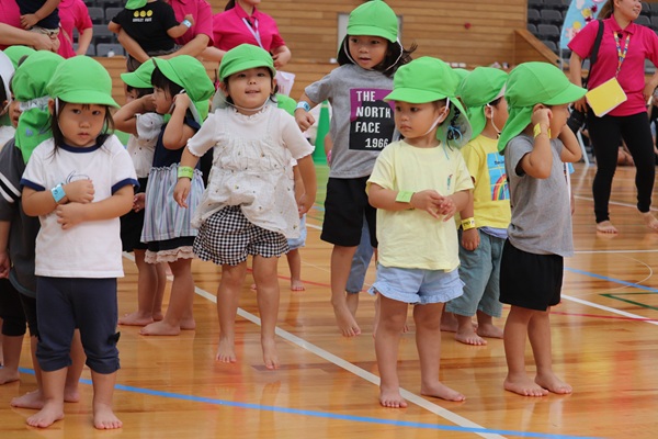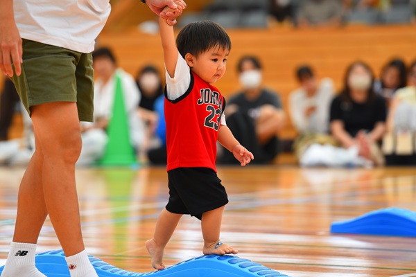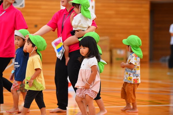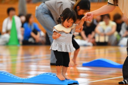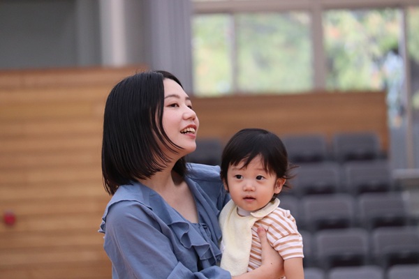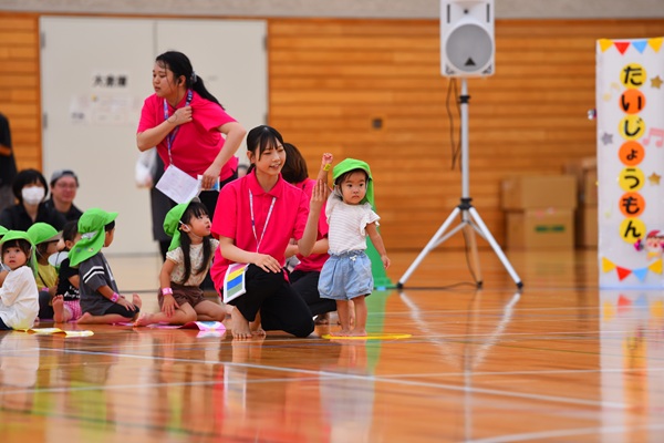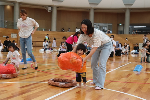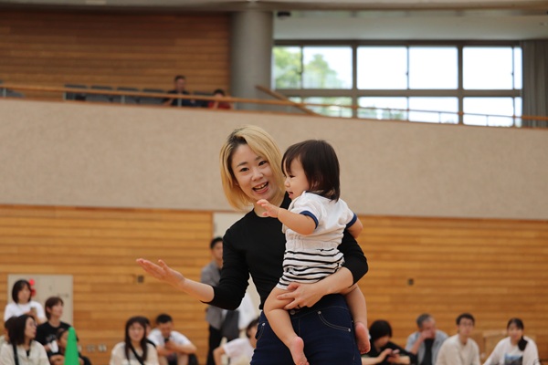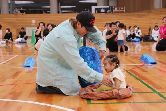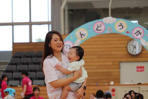 ひよこ組さんは、おうちの人とふれあい遊びを楽しみました。広い会場に少しびっくりしている様子もありましたが、ギューッとしてもらったり高い高いしてもらったりふれあい遊びをしている間はいつものニコニコ笑顔が見られました。