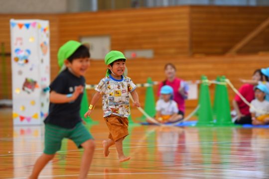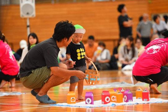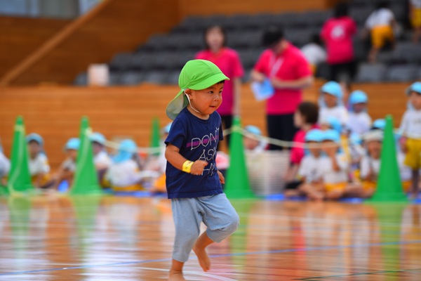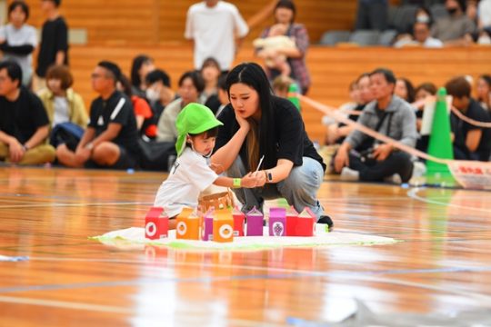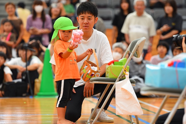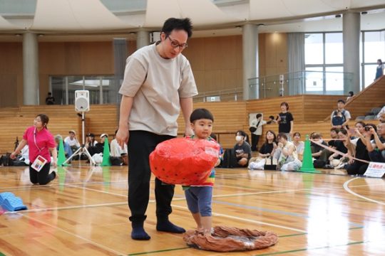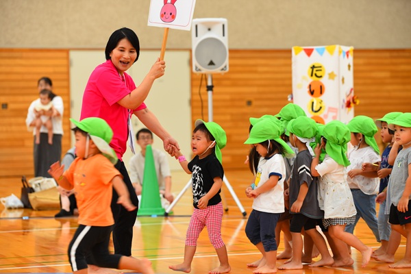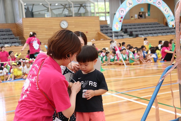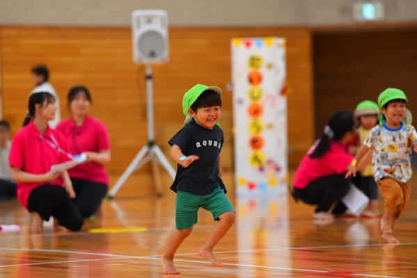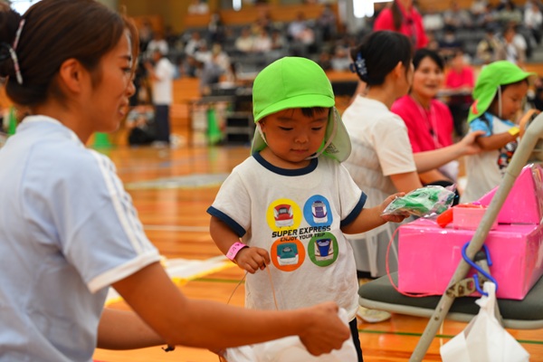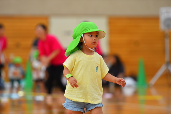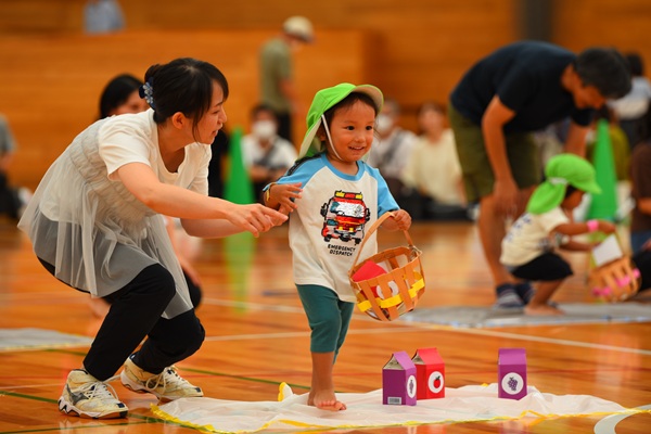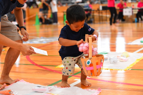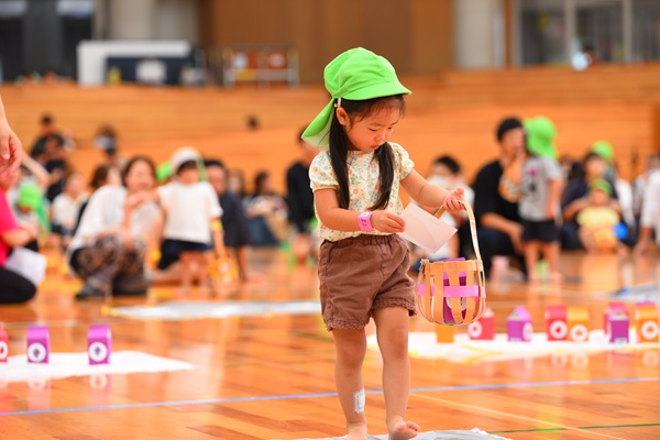 うさぎ組さんは、開会式から参加し、まずはかけっこをしました。ゴールには大好きなおうちの人が待っていて、ゴールした時にギュ―っと抱きしめてもらっているのがとても微笑ましかったです。そのあとは一緒に、おうちの人とお買いものへ行きカードを引いて出た品物を選んで、最後はちゃんとレジでバーコードに通していました。