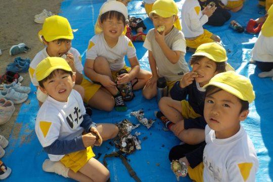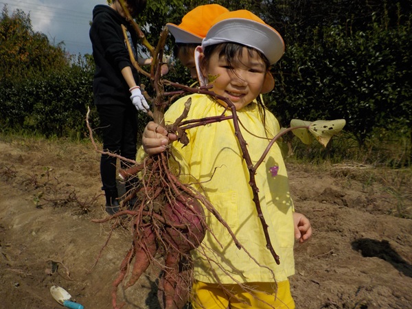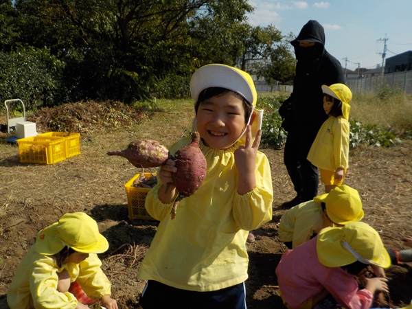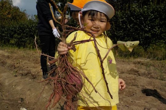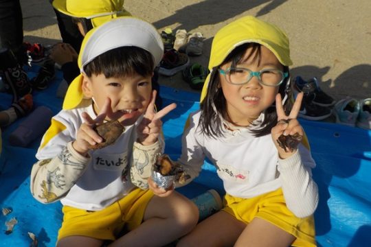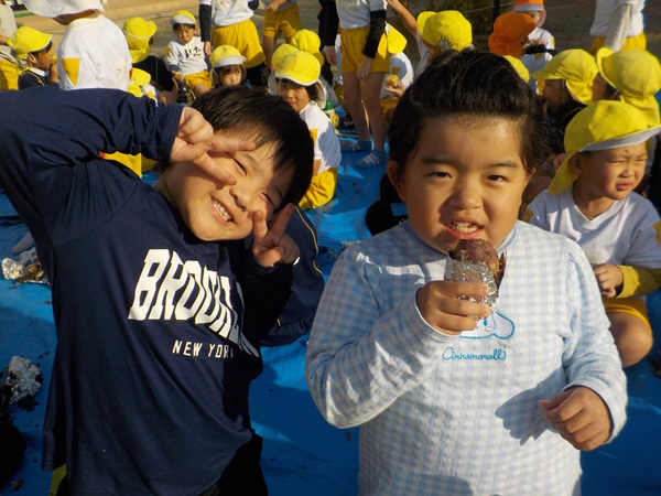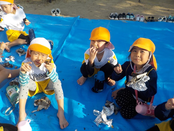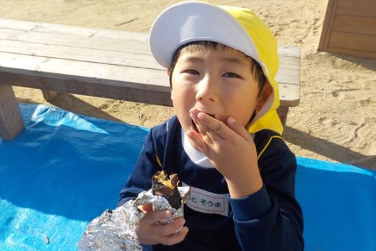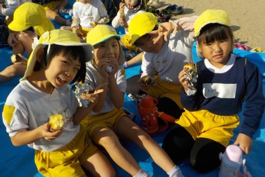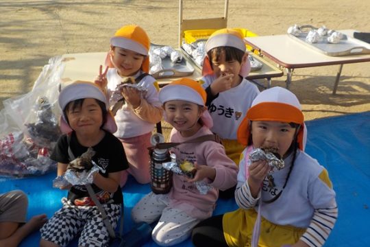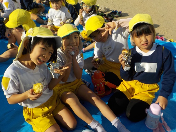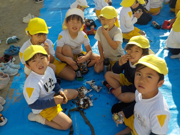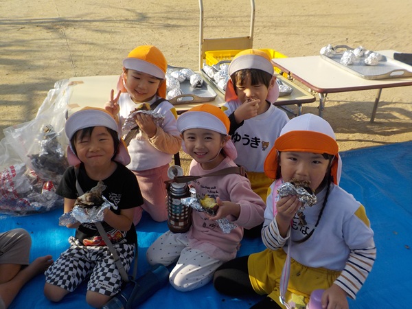 10月27日(月)に芋ほりをして、11月14日(金)に焼き芋をしました。土が固いかなと心配していましたが、思ったほど固くもなく頑張って掘ってくれました。ぱんだ組さんは苗植えの時と同じく年長さんにお手伝いしてもらい、年長さんもリードしようと張り切っていましたよ。焼き芋にちょうど良いサイズの大きさが多く、焼き芋の日を楽しみにしていました。焼き芋の日当日は、何回もおかわりしてたくさん食べていた子どもたちです。