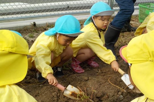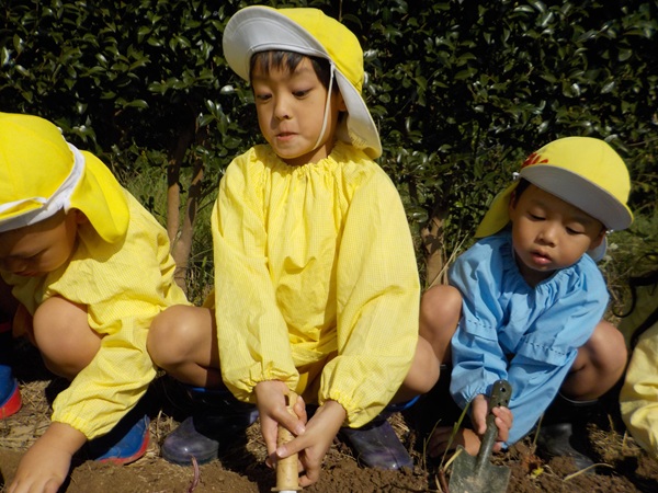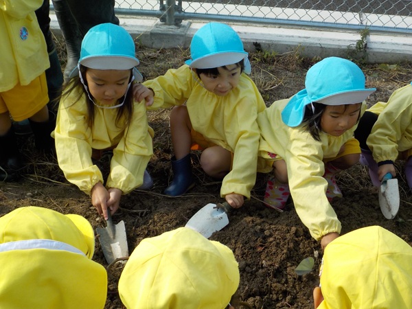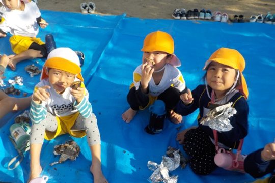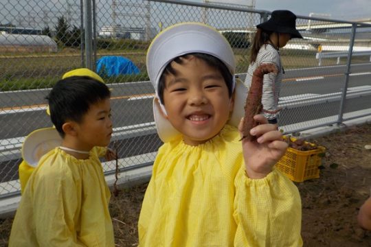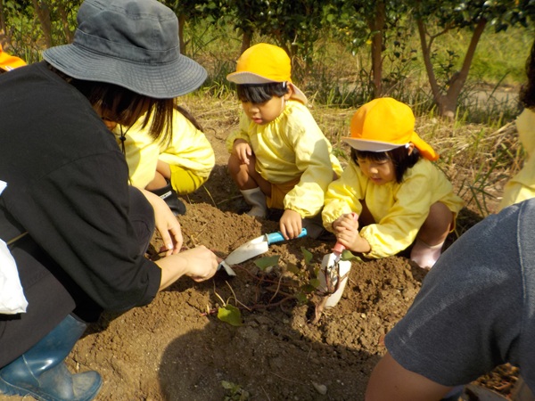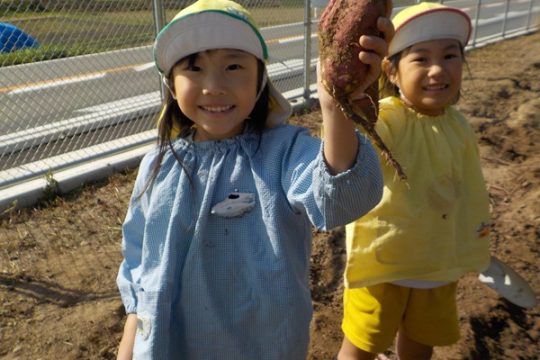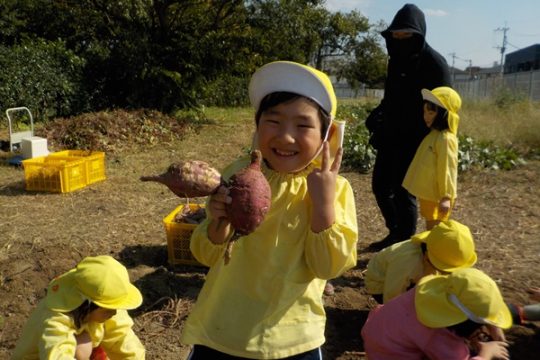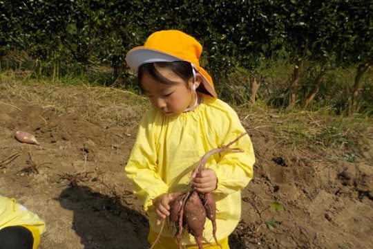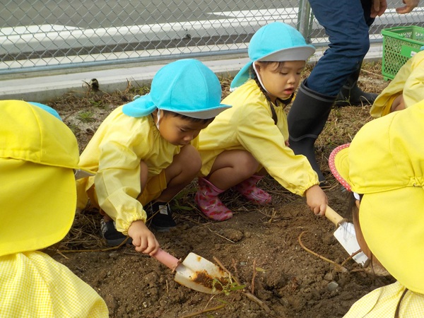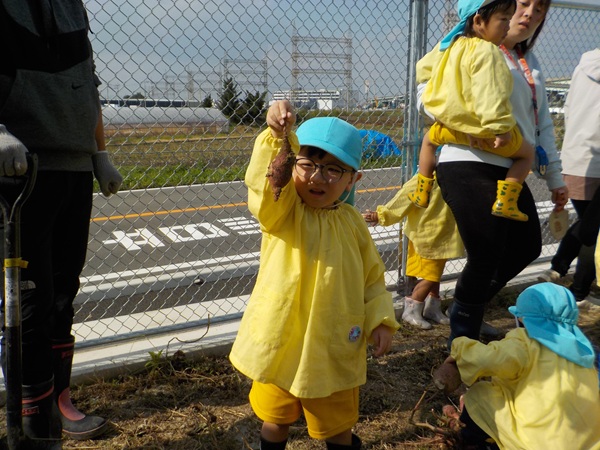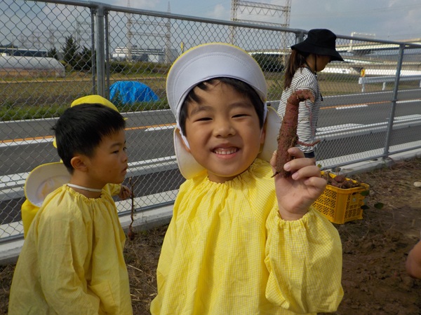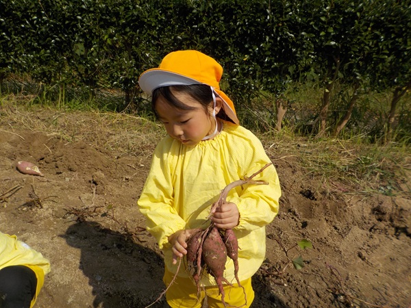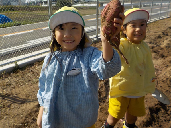 10月27日(月)に芋ほりをして、11月14日(金)に焼き芋をしました。土が固いかなと心配していましたが、思ったほど固くもなく頑張って掘ってくれました。ぱんだ組さんは苗植えの時と同じく年長さんにお手伝いしてもらい、年長さんもリードしようと張り切っていましたよ。焼き芋にちょうど良いサイズの大きさが多く、焼き芋の日を楽しみにしていました。焼き芋の日当日は、何回もおかわりしてたくさん食べていた子どもたちです。