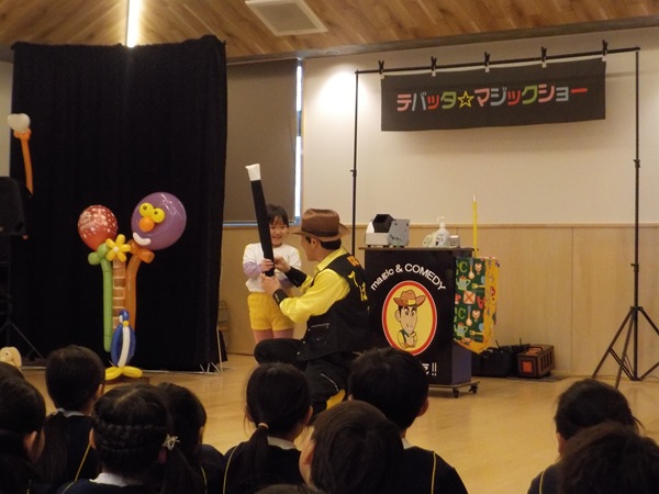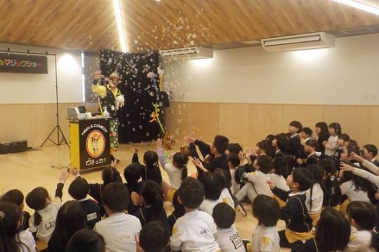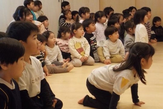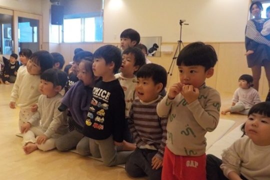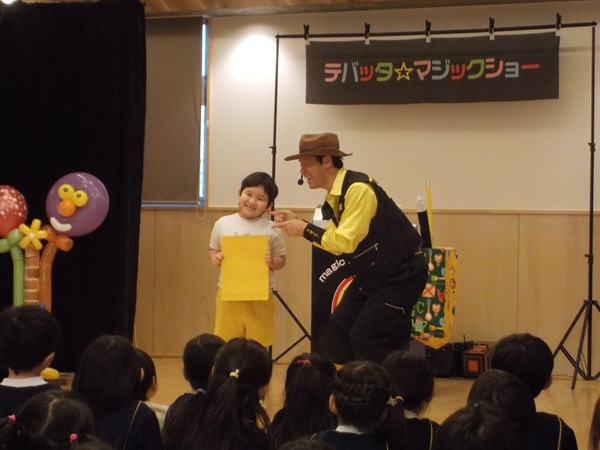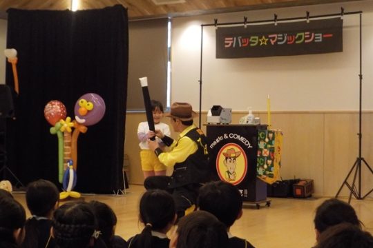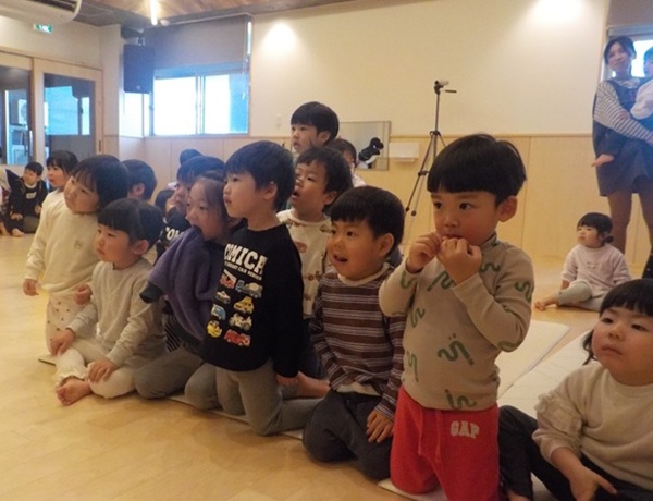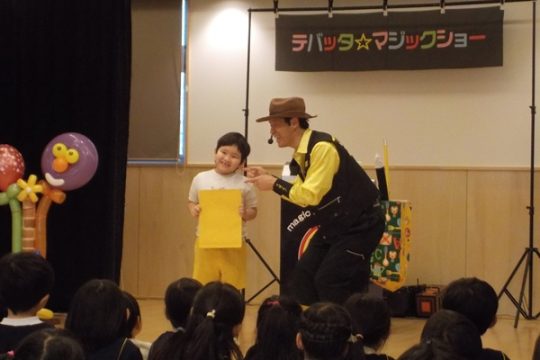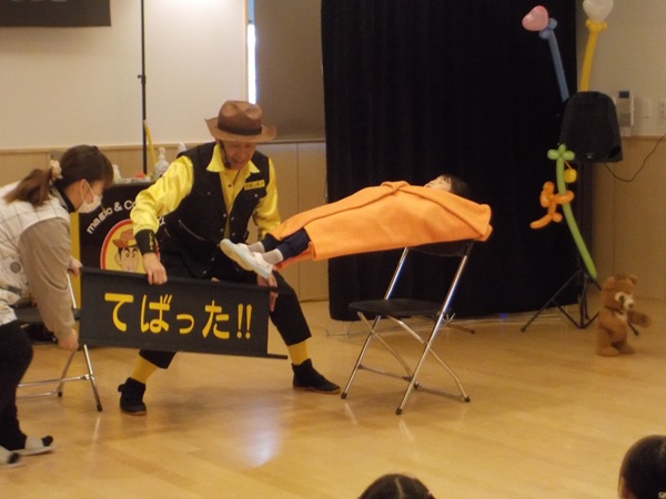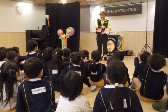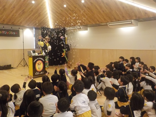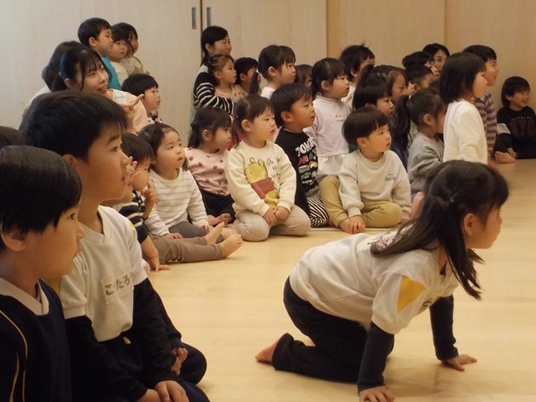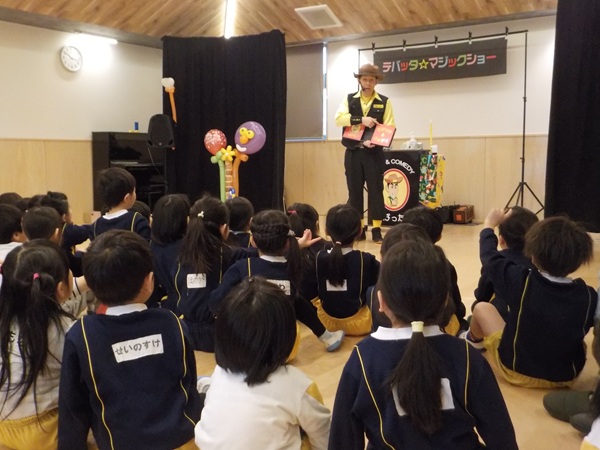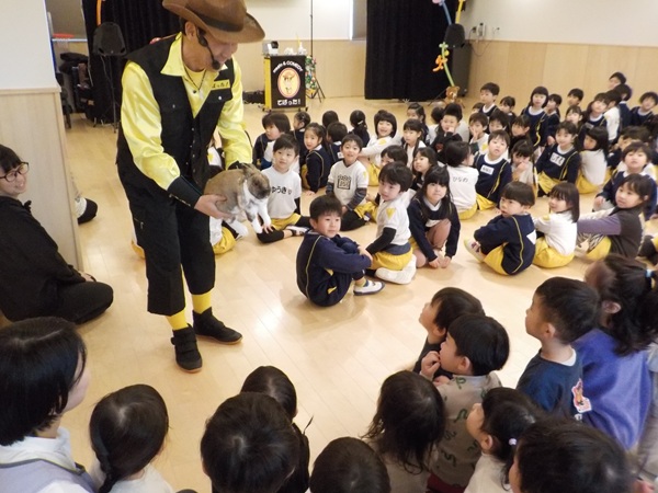 1月28日(水)に、マジシャンのテバッタさんをお招きして観劇会を行いました。どんなことが起こるんだろう?興味津々だった子どもたち。登場からテバッタさんの面白さにがっちりハートをつかまれ、ショーの間中みんな笑い転げるくらい盛り上がりました。うさぎ組さんもとっても集中して見入っていましたよ。マジックも面白さと不思議さがあり、笑いながらも「え~!!なんで~!」と子どもたち同士であれこれ考察していました。テバッタさんありがとうございました。